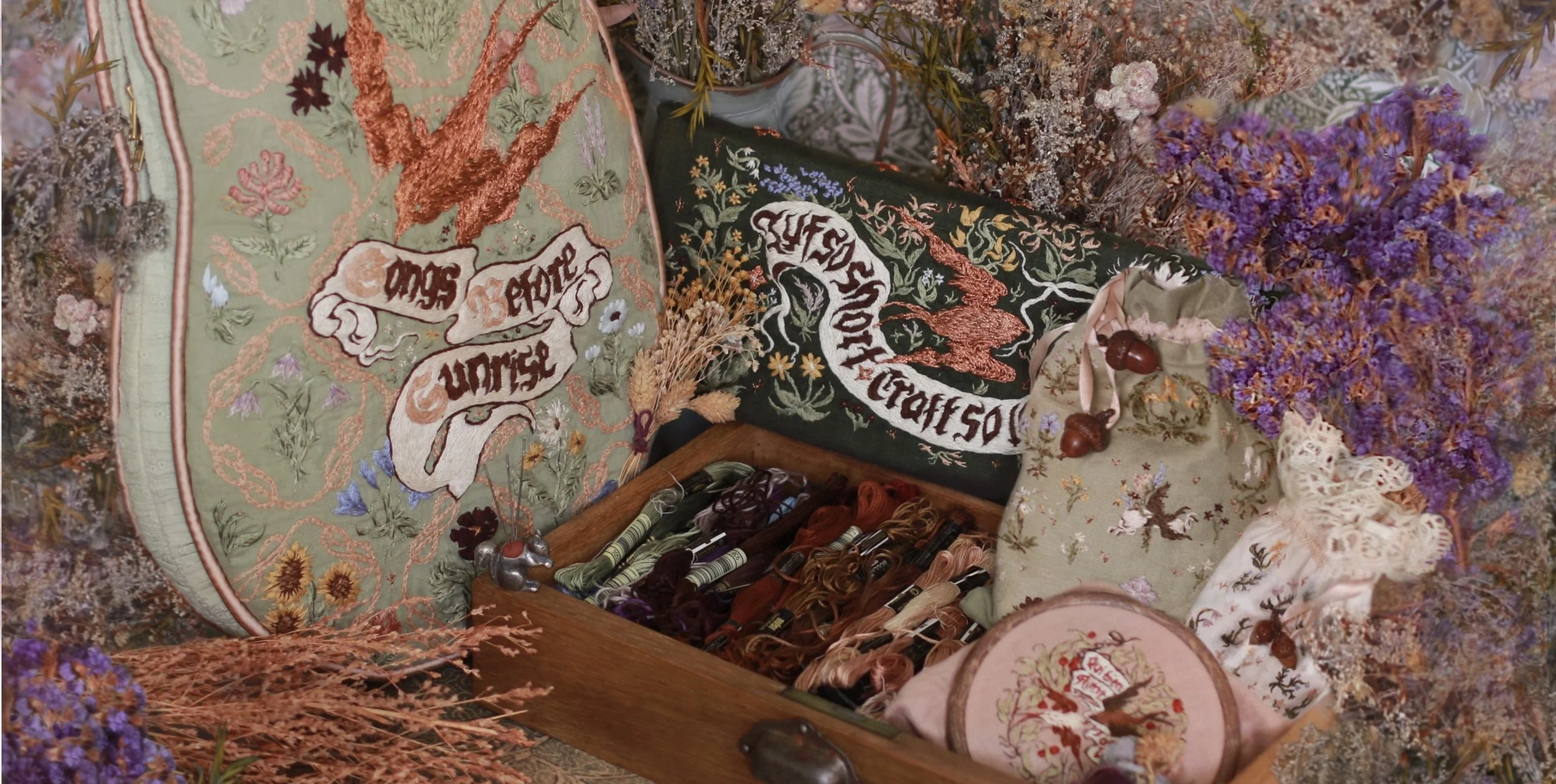 “ Conscious of the long history of women and embroidery, from domestic craft to fine art, my needlework aims to create a bridge between traditional and contemporary designs. Mingling medieval, romantic and folk styles of decoration to explore cloth as a cultural storyteller.”
