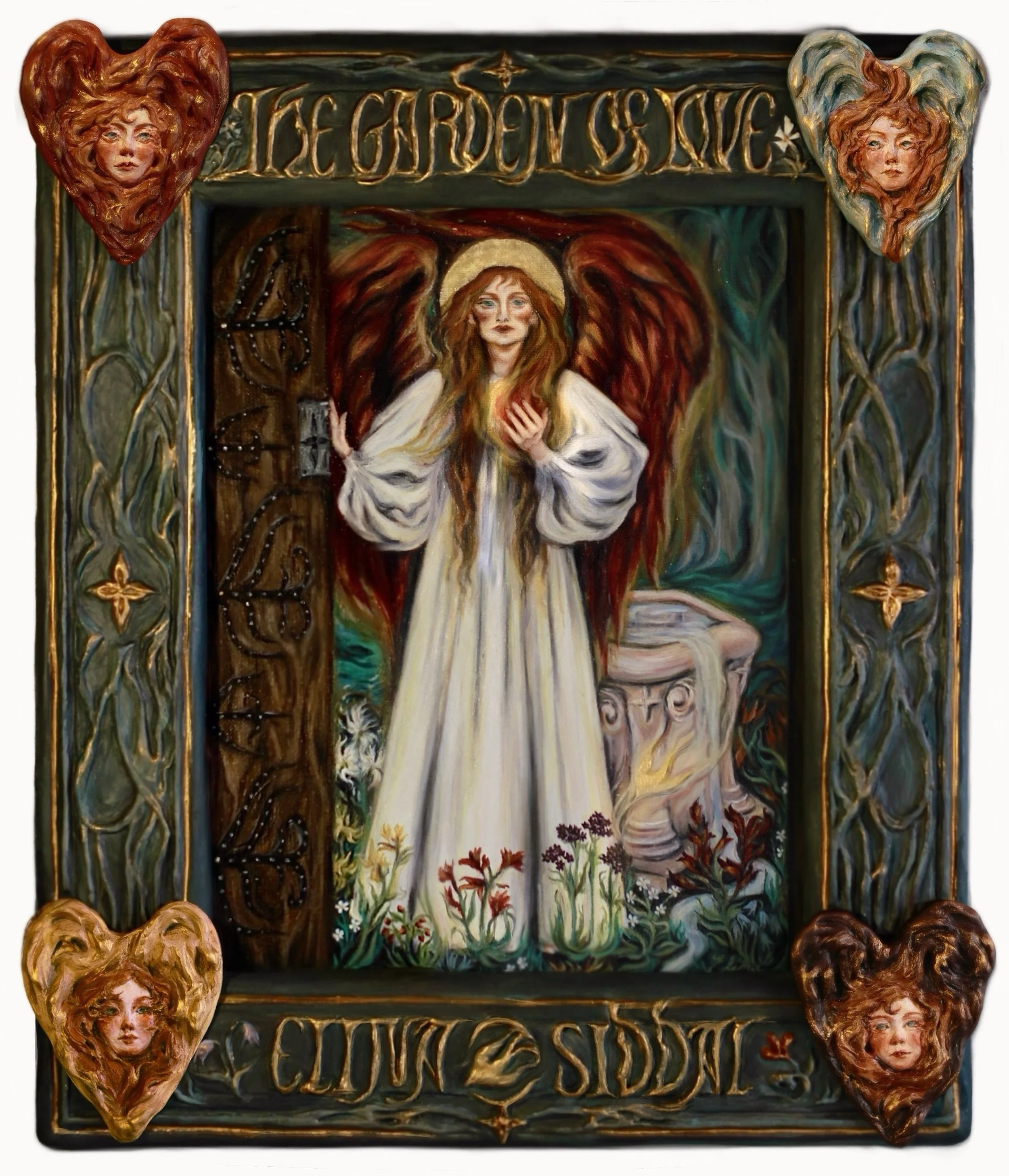 The Garden of Love, oil and gold leaf on linen canvas, artist sculpted frame, 50x42cm, 2023. ©Elina Siddal